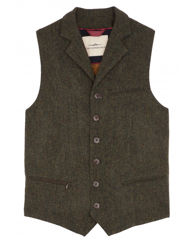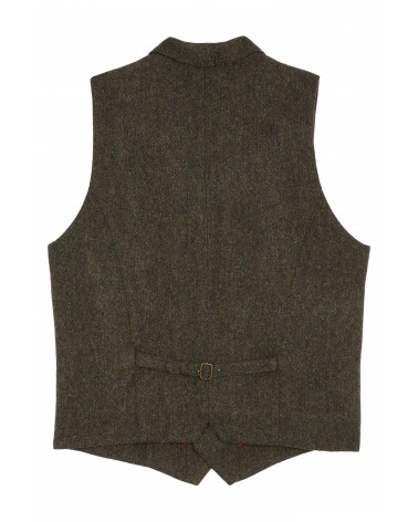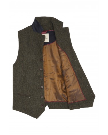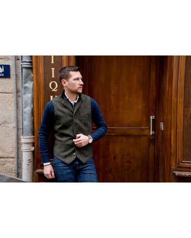 Gilet de costume en tweed vert kaki foncé chiné aux teintes automnales.
